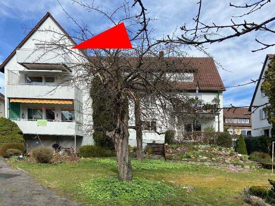 Diese 2-Zimmer-Wohnung liegt im Dachgeschoss eines 6-Familienhauses. Das Wohnzimmer mit dem vorgelagerten Balkon ist nach Süden hin ausgerichtet und hat den Blick in den Garten an der Südseite des Hauses.